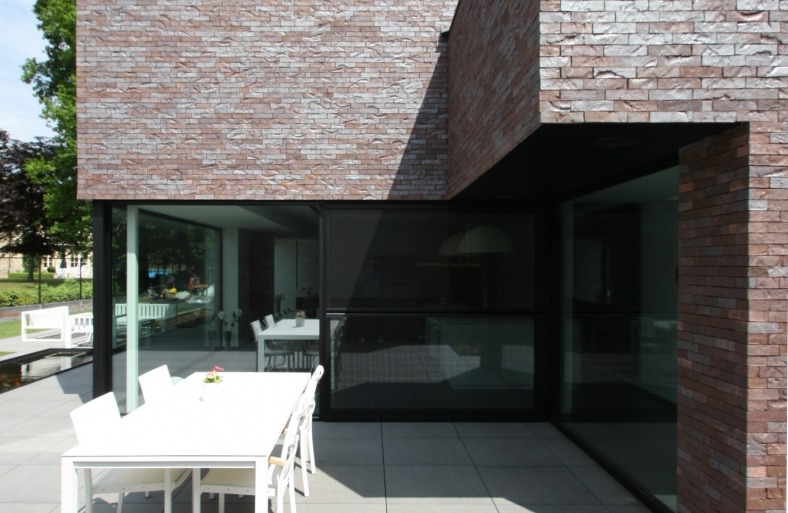 Deze architectenwoning met bureau is voorzien van geveldragers en lateien met een zwarte structuurcoating. De verankering werd gemaakt in de betonbalken of de voorziene stalen liggers, de consolebreedte werd hier aangepast in functie van het type stalen ligger. Binnen- en buitenhoeken werden telkens in verstek gemaakt.